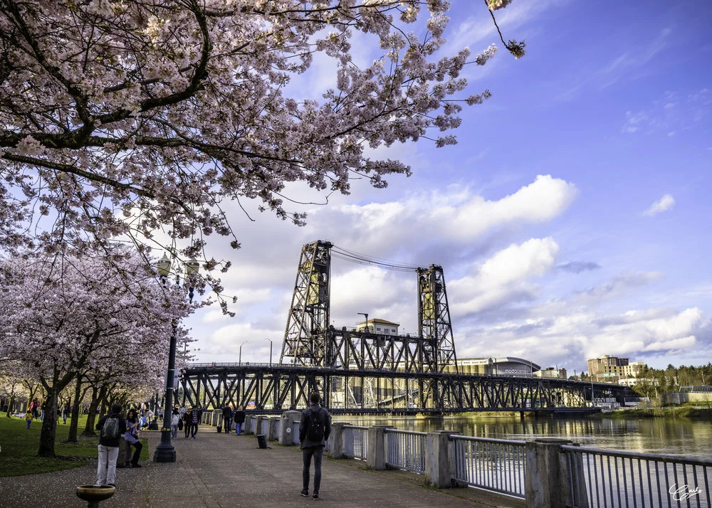 Portland's Old Steel Bridge as viewed from the Tom McCall Waterfront Park. Photo by Carlo © 2017. All Rights Reserved.